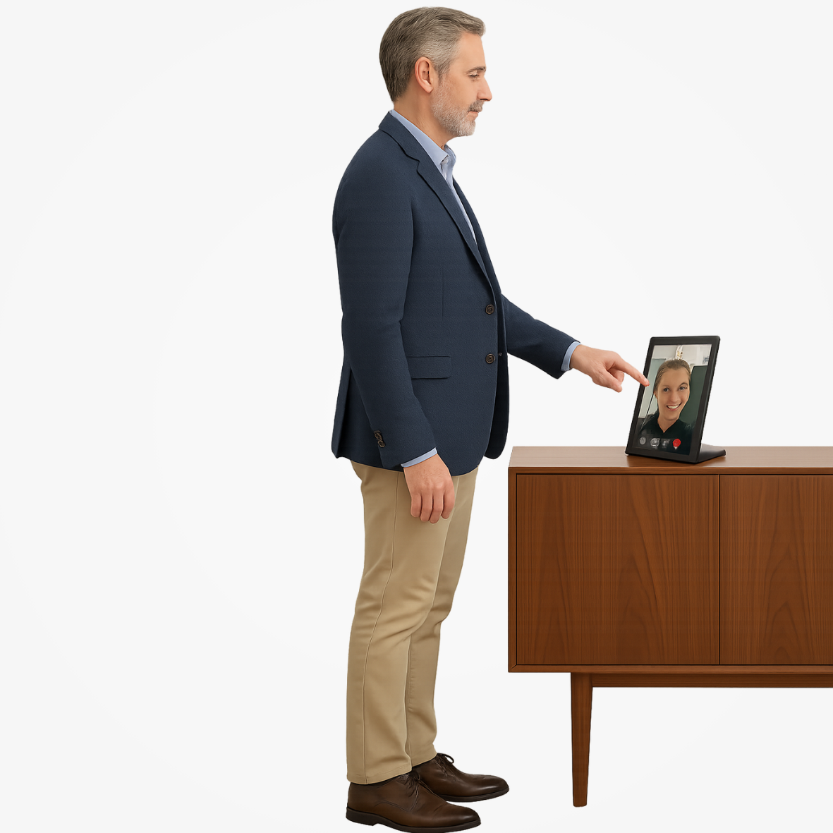 Monitor inteligente de sobremesa con diseño en forma de "L". Permite el uso del sistema sin necesidad de móviles personales, ideal para porterías, viviendas o zonas comunes. Requiere conexión a Internet local (WiFi o cable RJ45).